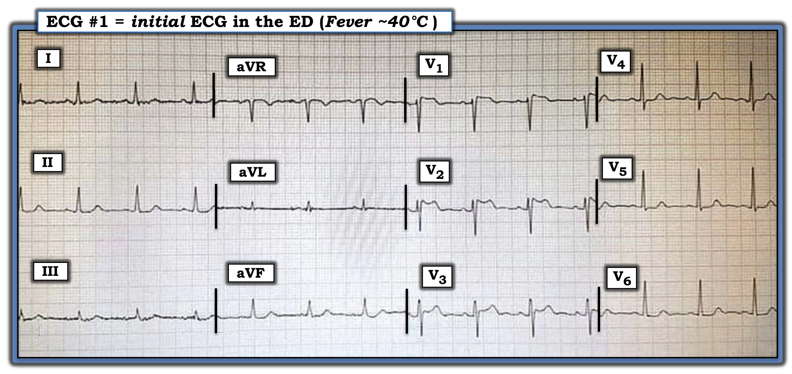 The ECG shown in Figure-1 was obtained from an elderly woman, who presented to the ED (Emergency Department) with an acute febrile illness (40°C).