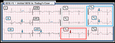 Lead-to-lead comparison in Figure-3 of today's initial ECG with the post-PCI tracing — shows obvious improvement (deflation of ST-T wave findings) in each of the 9 leads that I highlight above as supportive of my diagnosis of acute postero-lateral OMI.